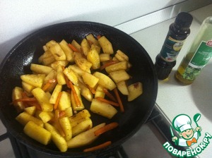 • Действие первое: на раскаленной сковороде, простите, сцене. появляется морковь. Она участвует скорее для придания красивых оранжевых нот в блюде. Морковь солирует в гордом одиночестве минут пять, и затем к ней присоединяется красавица Тыква. Обжариваются минут 10 на достаточно сильном огне. Затем их нужно переложить в другую посуду.