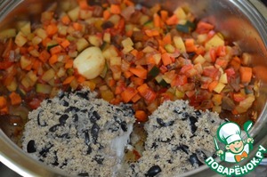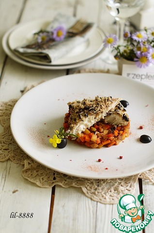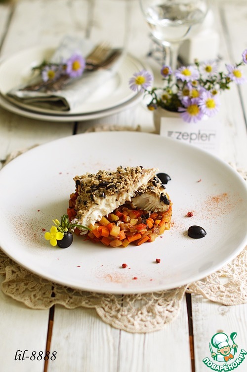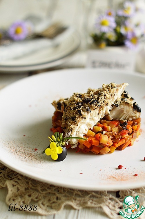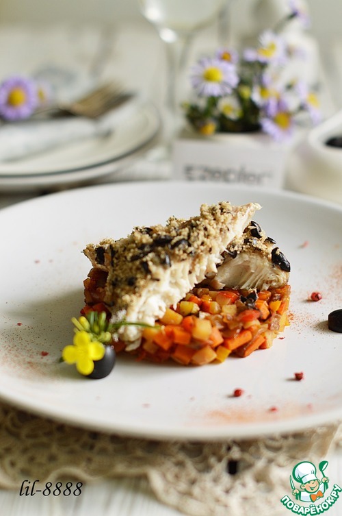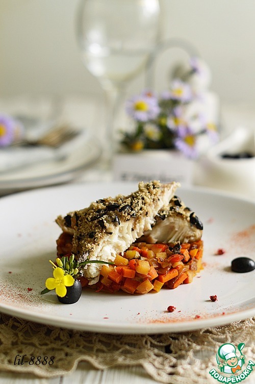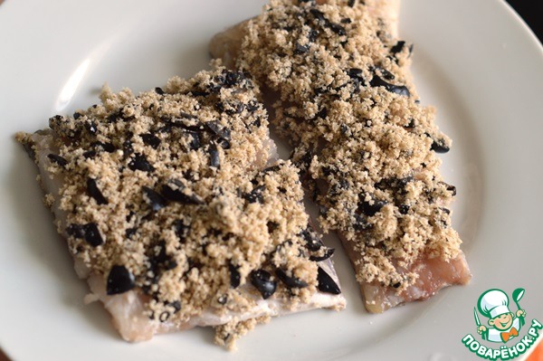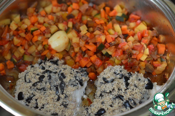 Выложить смесь на рыбу. Рыбу мы не солим, но благодаря маслинам вкус будет сбалансированный.