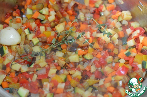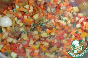 Сотейник Zepter накрыть крышкой, поставить на средний огонь. Когда стрелка термоконтроллера дойдет до середины зеленого поля по шкале Dry-можно начинать готовить. Овощи выложить в сотейник и помешивая обжарить 2-3 минуты.