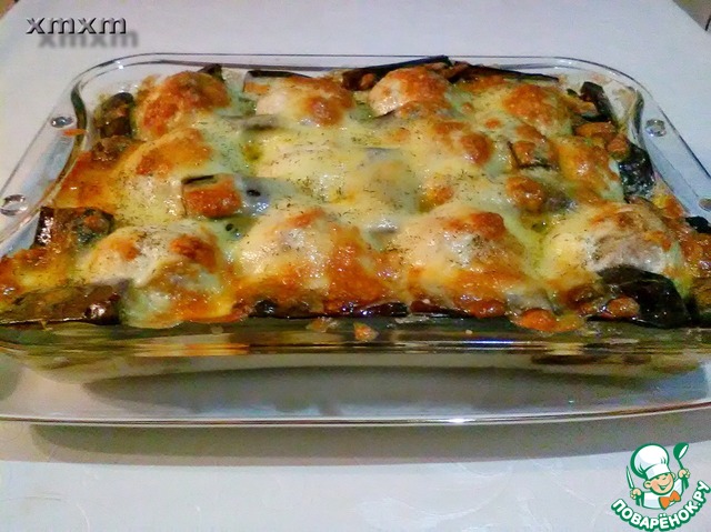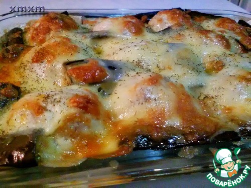 Через 40 минут, вынимаем противень и посыпаем сыром всю поверхность. Отправляем обратно в духовку еще минут на 10. до появления золотистого цвета. Блюдо готово.