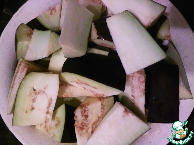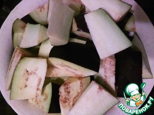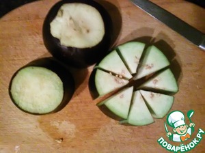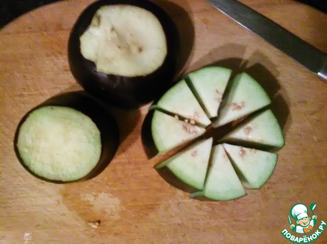 Первым делом нужно нарезать баклажаны. Режем вот так.
