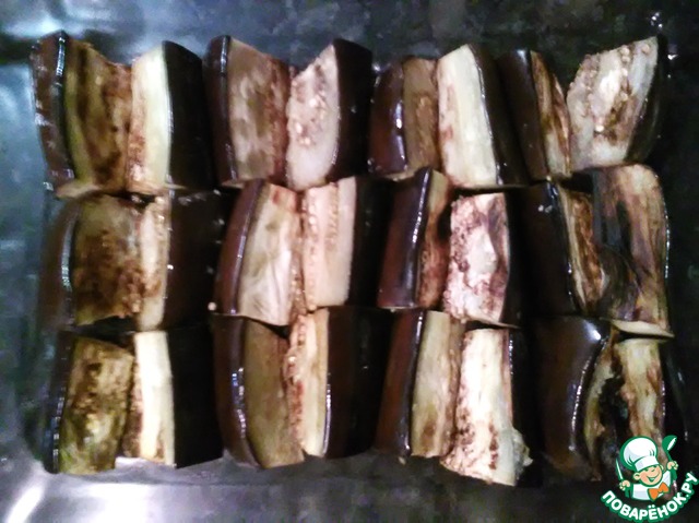 Обжаренные баклажаны выкладываем в противень (в моем случае стеклянная форма). Складываем как на фотографии. Уголками друг к другу.