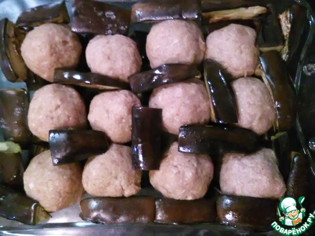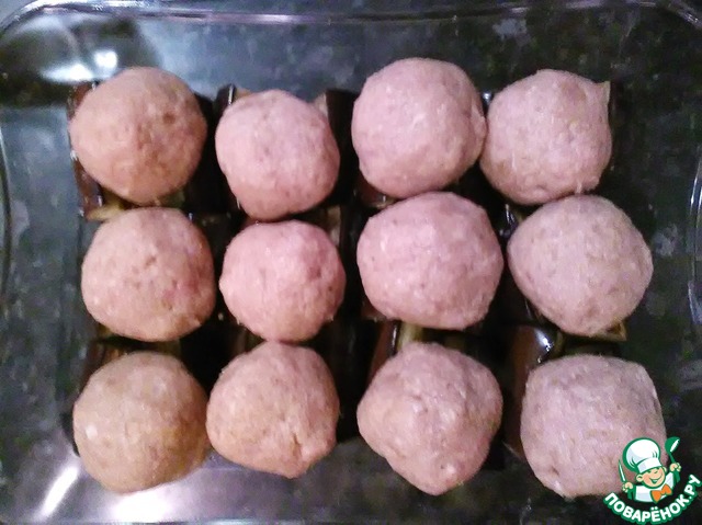 Далее, из фарша приготовим тефтели размером с теннисный шарик. Выкладываем их по верх баклажан. Фарш на тефтели используйте любимый. Я готовлю по своему рецепту. Кому интересно, зайдите сюда http://www.povarenok .ru/recipes/show/127 751/.