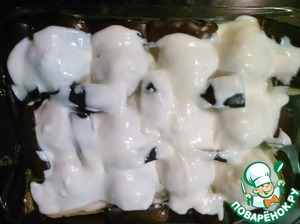Заливаем соусом всю поверхность и отправляем в духовку. Включаем ее на 180 градусов.