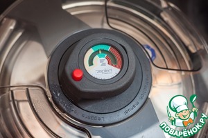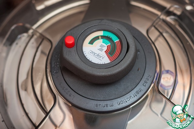 Закрыть крышкой Syncro-Clik. Крышка закрывается очень легко, буквально двумя пальцами. Ставим на максимальный огонь и ждем, когда поднимется красная кнопка, которая сигнализирует о том, что нужное давление в кастрюле достигнуто