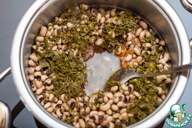 Перемешиваем, добавляем еще немного свежей зелени. Фасоль получилась нежнейшая, но целенькая, мясо можно губами есть! Теперь добавьте соль и специи по вкусу.