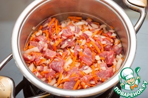 Лук, морковь и чеснок мелко нарезать, положить в холодную кастрюлю Zepter. Мясо нарезать небольшими кусочками, добавить к овощам, перемешать.