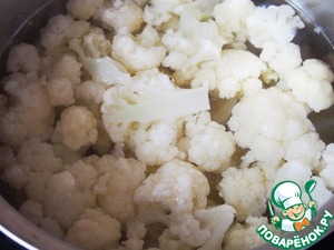Цветную капусту разобрать на соцветия (можно использовать замороженную), варить в кипящей воде 5 -7 минут.