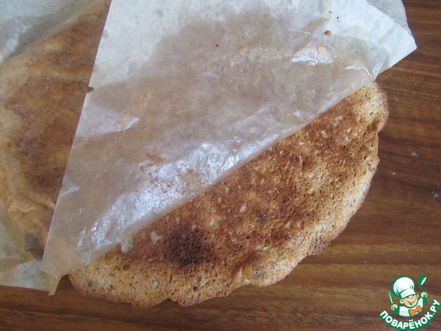 После того как корж будет готов, переворачиваем его на стол и мокрой салфеткой смачиваем пергамент.