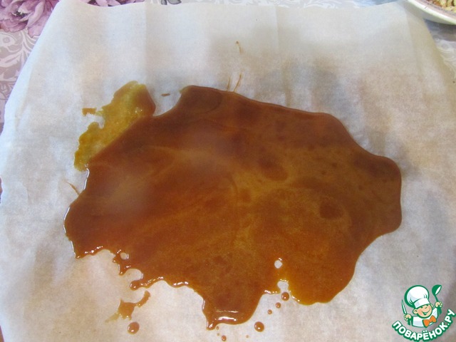 Затем делаем также как и с коржами, переворачиваем и смачиваем пергамент мокрой салфеткой, отделаем бумагу от карамели. -
