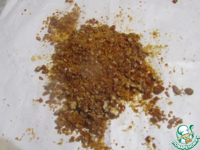 Карамель измельчаем, но не сильно мелко, чтобы были небольшие кусочки. (я это делала скалкой на доске)