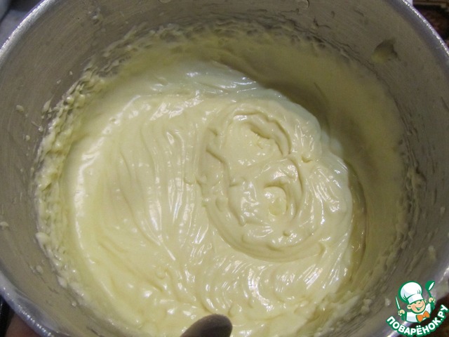 В остывший заварной крем вбиваем мягкое сливочное масло.