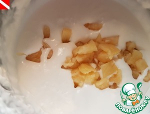 Ананасы нарезать на небольшие кусочки, обсушить кухонным бумажным полотенцем