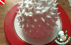 Меренгу перекладываем в кондитерский мешок, у меня вообще без насадки, просто кончик для нее. Отсаживаем подобие ананасовой кожуры