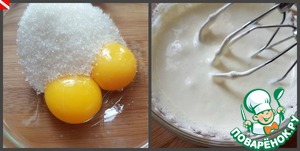 В желтки кладем сахар и тот час же взбиваем миксером до образования однородной белой массы.