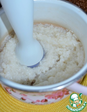 Сливки нагреть, влить в кашу, пробить погружным блендером.