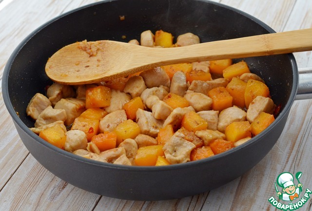 К готовой курице добавить кусочки тыквы, аккуратно перемешать, попробовать на вкус и, если нужно, добавить соус соевый и, может быть, и меда.