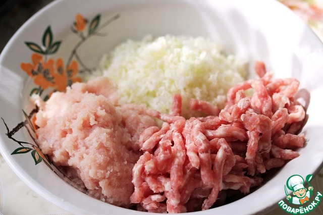 В миску сложить мясной фарш, измельченные куриное филе и капусту.