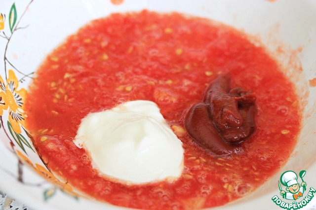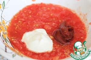 Приготовить соус: помидоры разрезать на половинки и натереть на крупной терке (шкурки выбросить), добавить ложку томатной пасты, пару ложек сметаны, приправы и хорошо размешать.