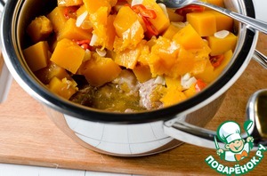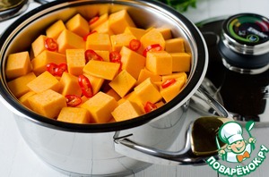 Тыкву очистить от кожуры и также нарезать кубиками, перец нарезать колечками, чеснок кружочками. Накрыть крышкой.