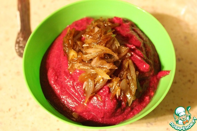 К свекольной массе добавить обжаренный лук и перемешать. Перед подачей охладить в холодильнике.