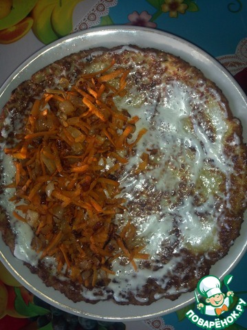 • Для первой начинки обжариваем лук с морковью, немного остужаем. Для второй- сыр натереть на крупной тёрке, добавить порезаные кубиками сосиски, майонез и чеснок, смешать. Готовый корж смазываем майонезом и на одну половину распределяем начинку, аккуратно сворачиваем рулет, кладём швом вниз.