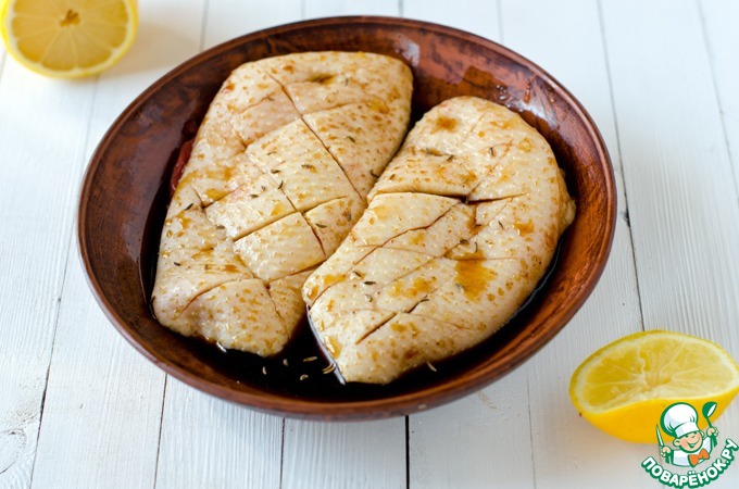 На утиных грудках сделать надрезы на коже и замариновать в соевом соусе, тмине и соке лимона на 2-4 часа.