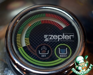 Накрыть крышкой. Стрелка должна находиться в середине зеленого поля. Благодаря уникальной технологии Zepter, запахи и соки блюд в сковороде и в пароварке не смешиваются, каждое блюдо готовится само по себе. Через 20 минут отключить плиту и оставить при закрытой крышке ещё на 15 минут.