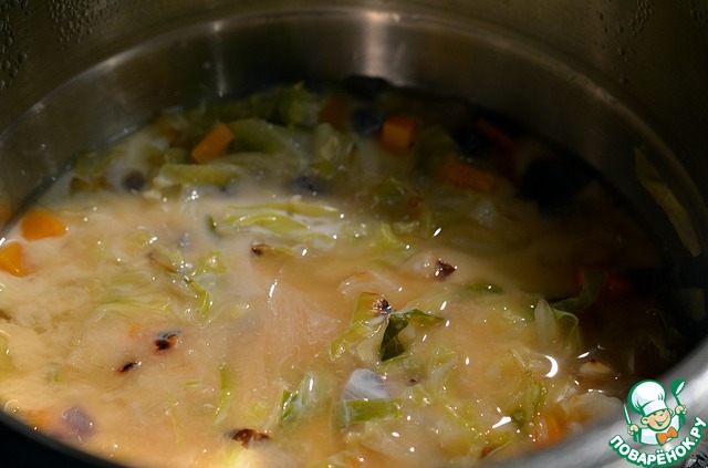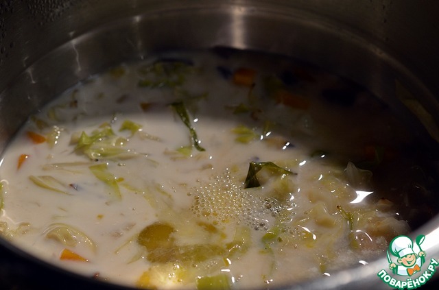 Через 10 минут добавить молоко и добавить яйцо (предварительно взбить вилочкой).