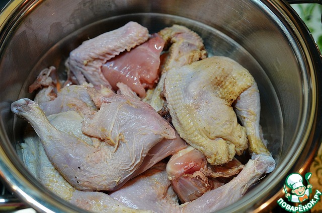 Курицу нарезать на большие куски и выложить в холодную кастрюлю Zepter. Вы можете взять любые части курицы. У меня куры свои, и я взяла 2 маленьких цыплёнка.
