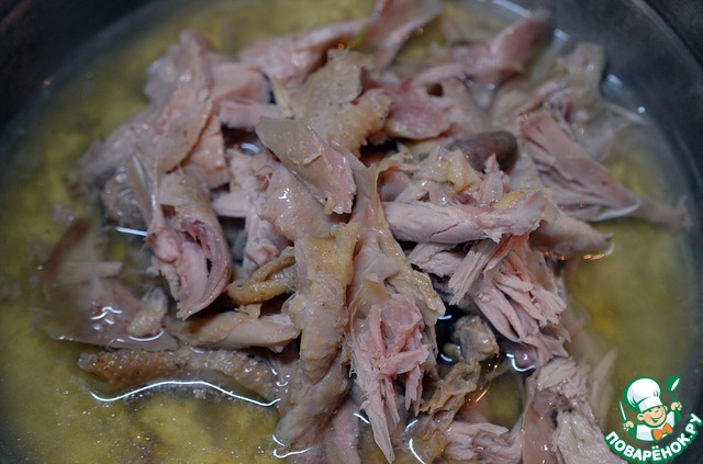 Через 30 минут курицу вытащить, снять с неё мясо, нарезать и вернуть в кастрюлю.