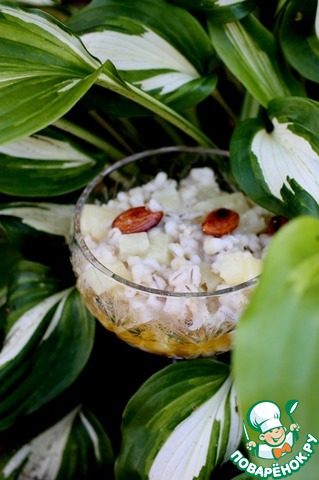Смешать готовую перловую крупу, нарезанный ананас и обжаренный миндаль. -
