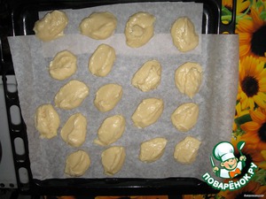 На противень стелем бумагу для выпечки и выкладываем ложкой порции теста. У кого есть кондитерский шприц, вполне заменит ложку. Но я предпочитаю народный способ, потому как в мешке или шприце остается много теста. Да и мыть потом их неохота.