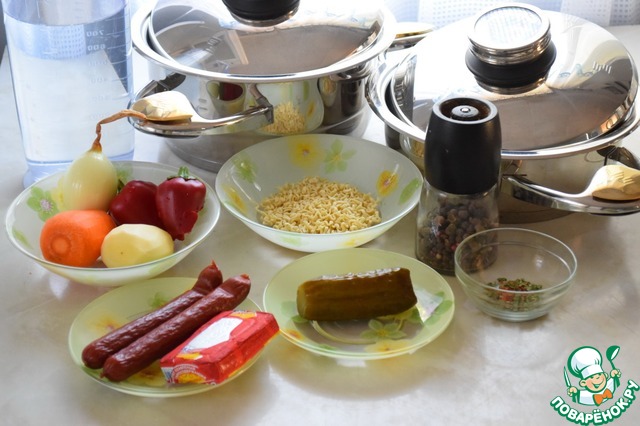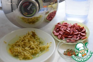 • Лук мелко порезать, сосиски порезать полукольцами.