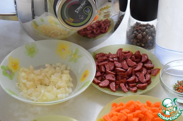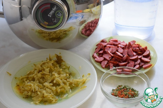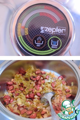 Сотейник ставим на средний огонь, закрываем крышкой и нагреваем до начала зеленого сектора (следим по внутренней шкале за стрелкой термоконтроллера). Выкладываем лук, сосиски и соленый огурец. Сотейник ничем не смазываем!!! Перемешиваем овощи и обжариваем 3-5 мин. (Перемешали, закрыли крышкой. Повторяем 2-3 раза).