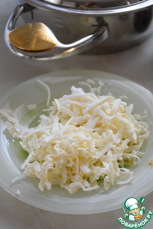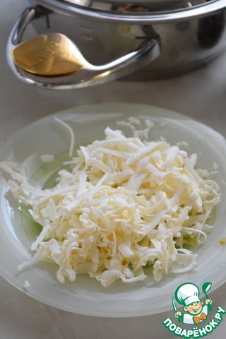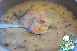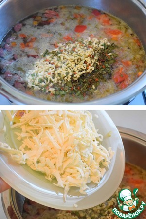 • Добавляем в суп лапшу, зелень, сыр. Перемешиваем.