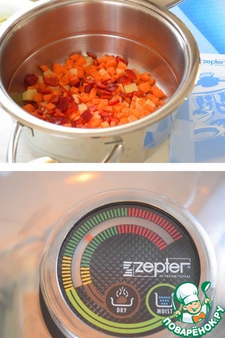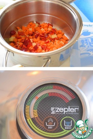 • Морковь, картофель и болгарский перец выкладываем в холодную кастрюлю. Накрываем крышкой и на среднем огне нагреваем кастрюлю с овощами до начала зеленого сектора (смотрим по внешней шкале термоконтроллера), огонь убавляем до минимального (или ставим на самую маленькую конфорку), доводим стрелку термокомтроллера до середины зеленого сектора (у меня на это ушло около 3 мин). Огонь отключаем и оставляем наши овощи "доходить" на 5 мин.