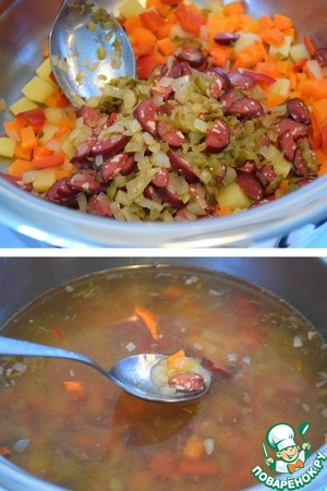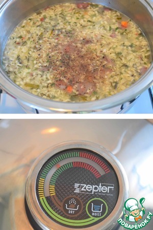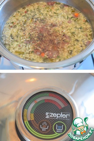 • Ставим кастрюлю на средний огонь, в кастрюлю выкладываем обжаренные овощи с сотейника, выливаем воду. Закрываем крышкой и на среднем огне доводим до кипения (стрелка на термоконтроллере за это время как раз дойдет до середины зеленого сектора (смотрим по внешней шкале). Варим суп 5 мин. Огонь отключаем.