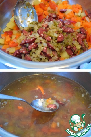Ставим кастрюлю на средний огонь, в кастрюлю выкладываем обжаренные овощи с сотейника, выливаем воду. Закрываем крышкой и на среднем огне доводим до кипения (стрелка на термоконтроллере за это время как раз дойдет до середины зеленого сектора (смотрим по внешней шкале). Варим суп 5 мин. Огонь отключаем.