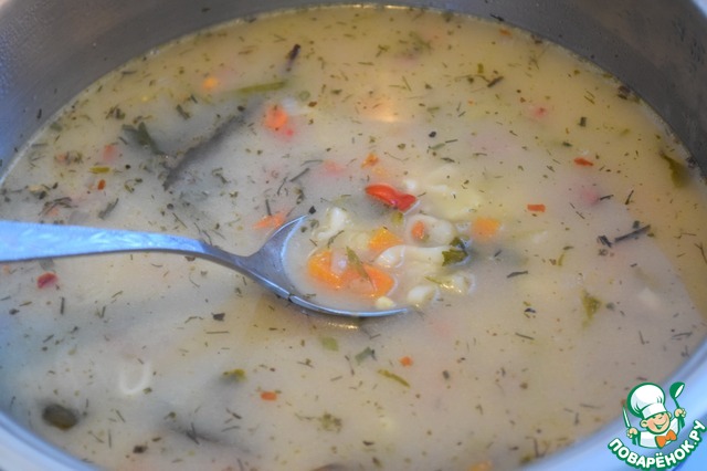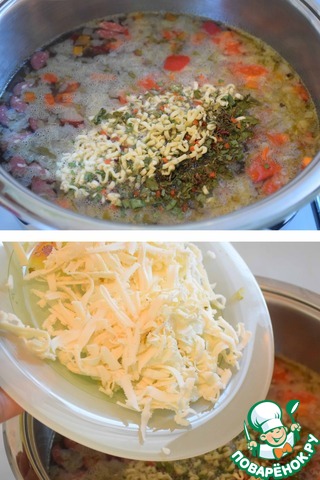 Добавляем в суп лапшу, зелень, сыр. Перемешиваем.