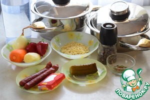 • Сотейник ставим на средний огонь, закрываем крышкой и нагреваем до начала зеленого сектора (следим по внутренней шкале за стрелкой термоконтроллера). Выкладываем лук, сосиски и соленый огурец. Сотейник ничем не смазываем!!! Перемешиваем овощи и обжариваем 3-5 мин. (Перемешали, закрыли крышкой. Повторяем 2-3 раза).