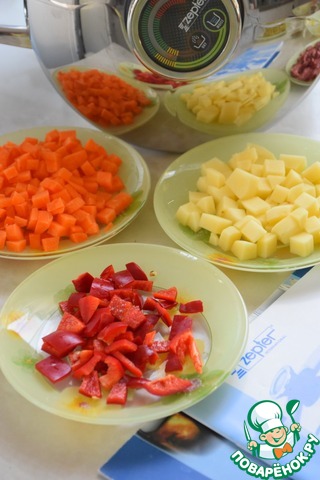 Морковь, картофель и болгарский перец выкладываем в холодную кастрюлю. Накрываем крышкой и на среднем огне нагреваем кастрюлю с овощами до начала зеленого сектора (смотрим по внешней шкале термоконтроллера), огонь убавляем до минимального (или ставим на самую маленькую конфорку), доводим стрелку термокомтроллера до середины зеленого сектора (у меня на это ушло около 3 мин). Огонь отключаем и оставляем наши овощи "доходить" на 5 мин.