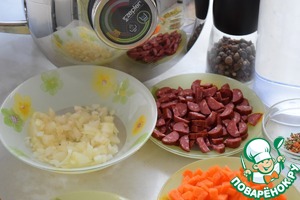Морковь, картофель и болгарский перец порезать средним кубиком.