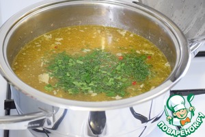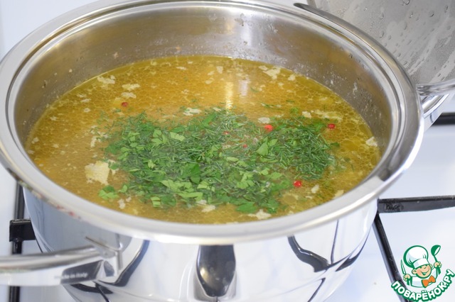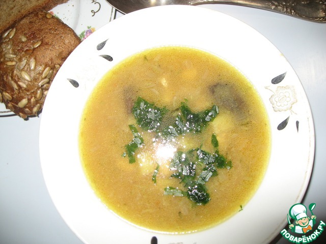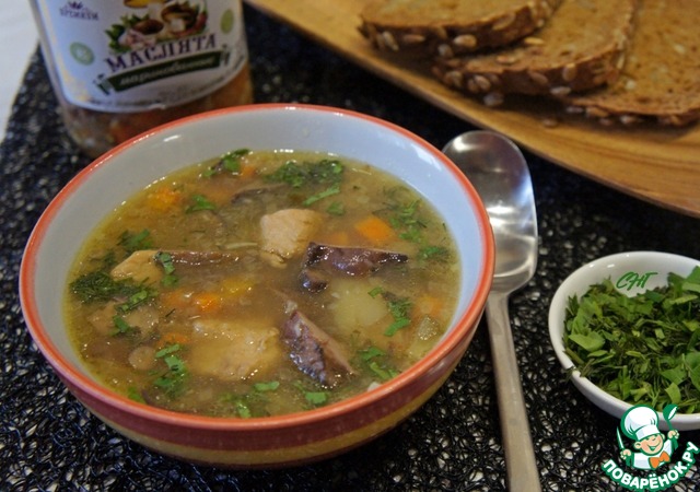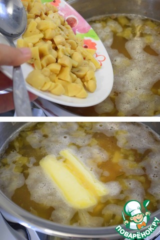 Добавляем грибы и сливочное масло. Оставляем суп еще на 5 мин.