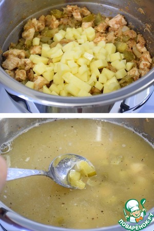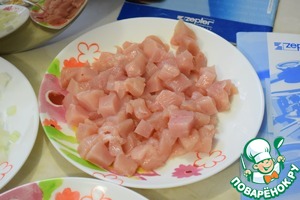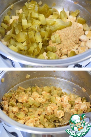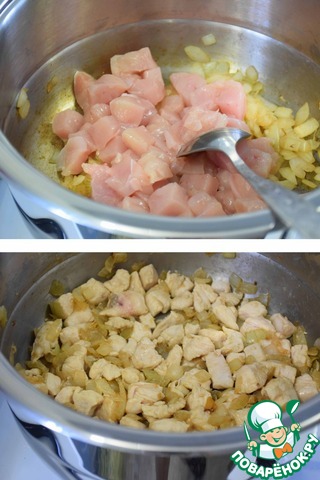 Добавляем куриное мясо, перемешиваем и обжариваем, помешивая, 2-3 мин.