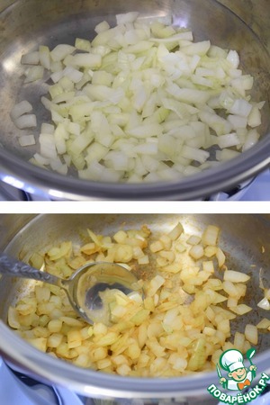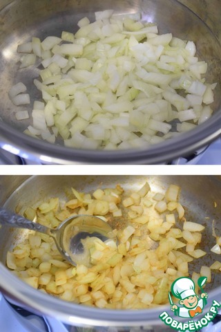 В сухую, ничем не смазанную кастрюлю, опускаем лук и обжариваем его, помешивая, 2 мин. до приятного золотистого цвета.