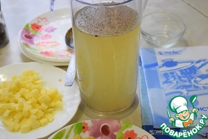 Подогреем бульон (если его нет, можно взять воду), добавим рассол, соевый соус, заменитель сахара, перец. Перемешаем. Подкорректируйте под свой вкус.