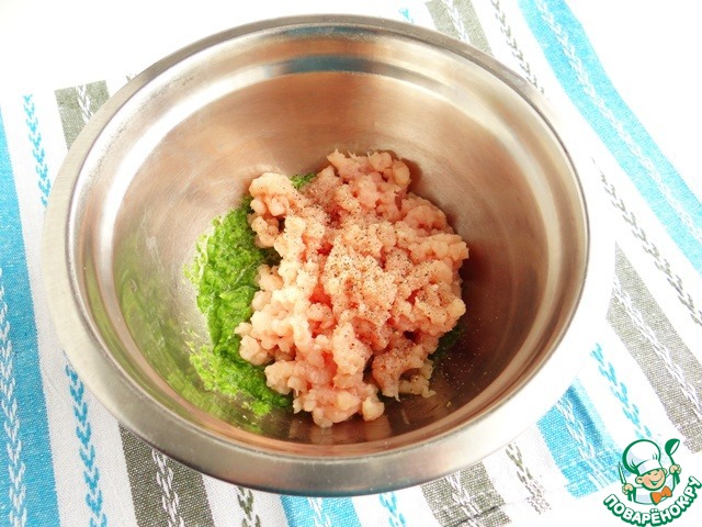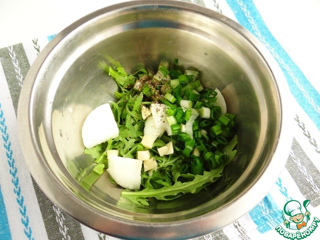 Сначала готовлю куриные фрикадельки с зеленью. В миске соединяю нарезанный зеленый лук, чеснок, рукколу, 1/2 часть крупно нарезанного репчатого лука, оливковое масло, прованские травы, перец черный молотый по вкусу.