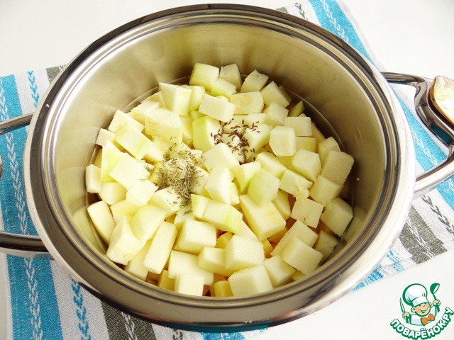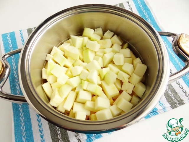 Кабачок тоже нарезаю кубиками, выкладываю на картофель.