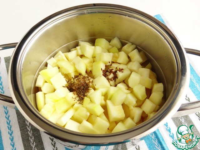 Картофель нарезаю кубиками, выкладываю в кастрюлю следующим слоем.